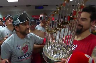 Watch the Washington Nationals pop champagne in the clubhouse following their game 7 World Series win over the Houston Astros.