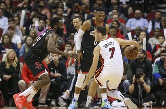 James Harden scored 34 points, Russell Westbrook had 27 and the Houston Rockets snapped a three-game skid with a 117-108 victory over the Miami Heat.